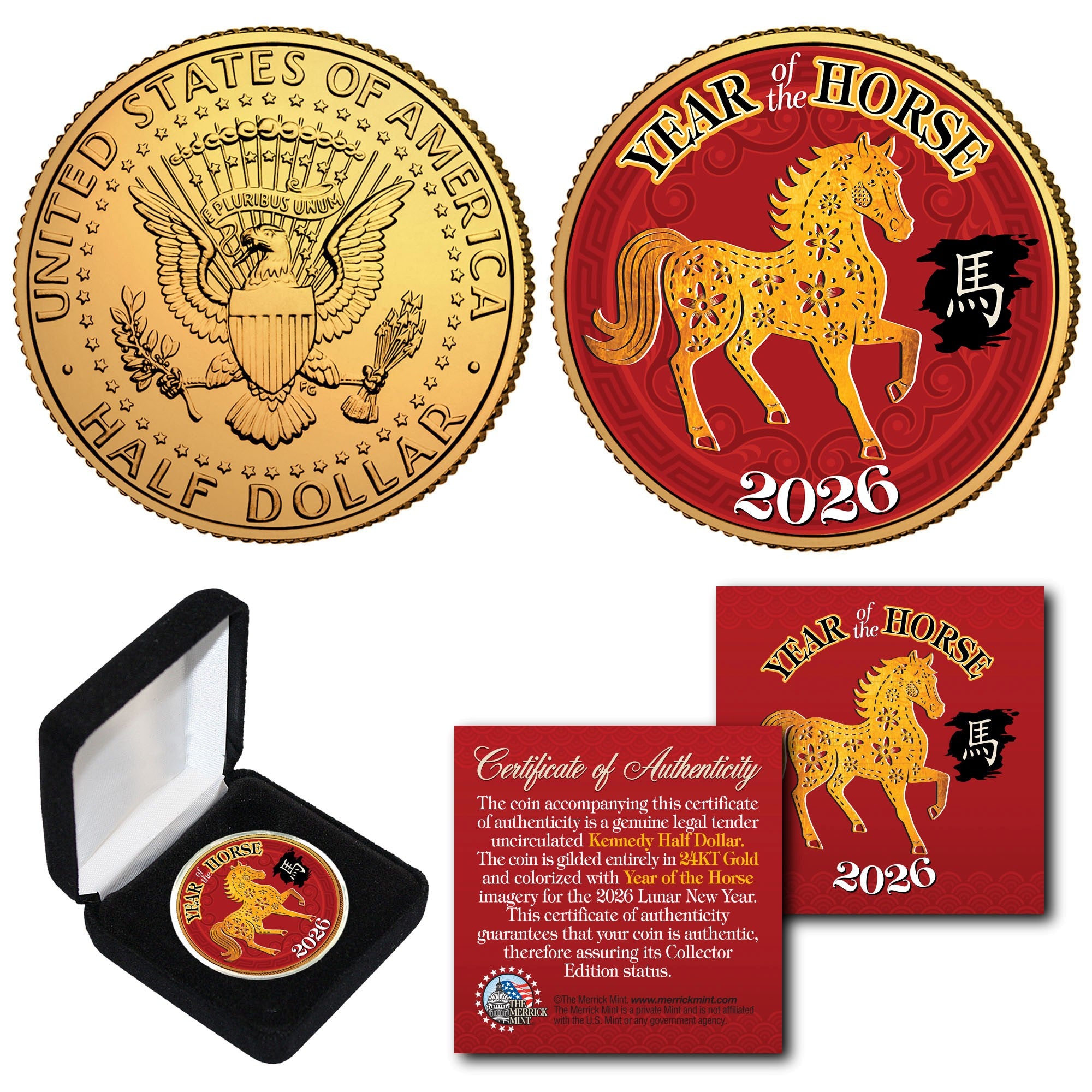 2026 Chinese New Year * YEAR OF THE HORSE * 24K Gold Plated JFK Kennedy Half Dollar Coin with DELUXE BOX