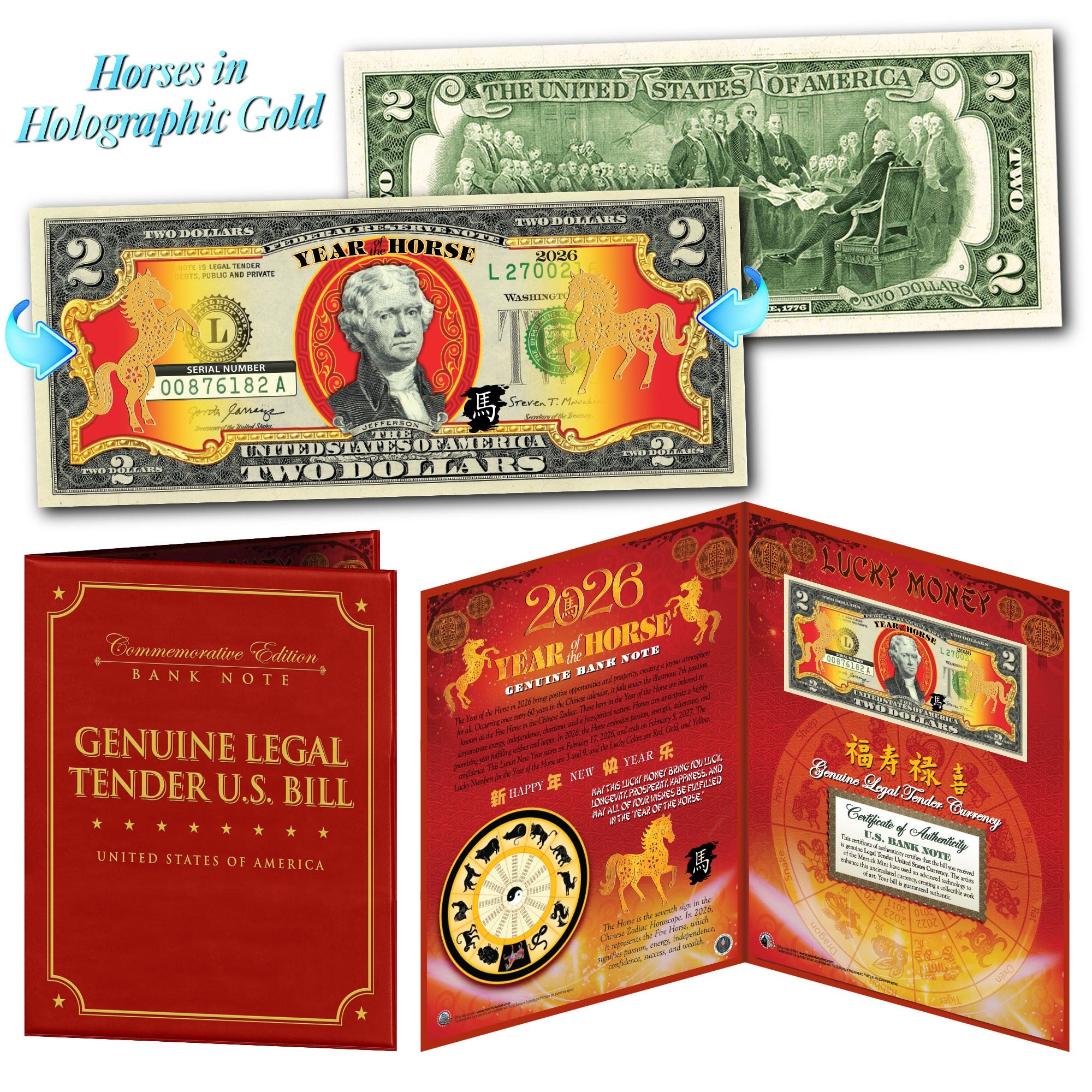 2026 Chinese New Year - YEAR OF THE HORSE - Gold Hologram Legal Tender U.S. $2 BILL - $2 Lucky Money in Large Collectors Folio Display