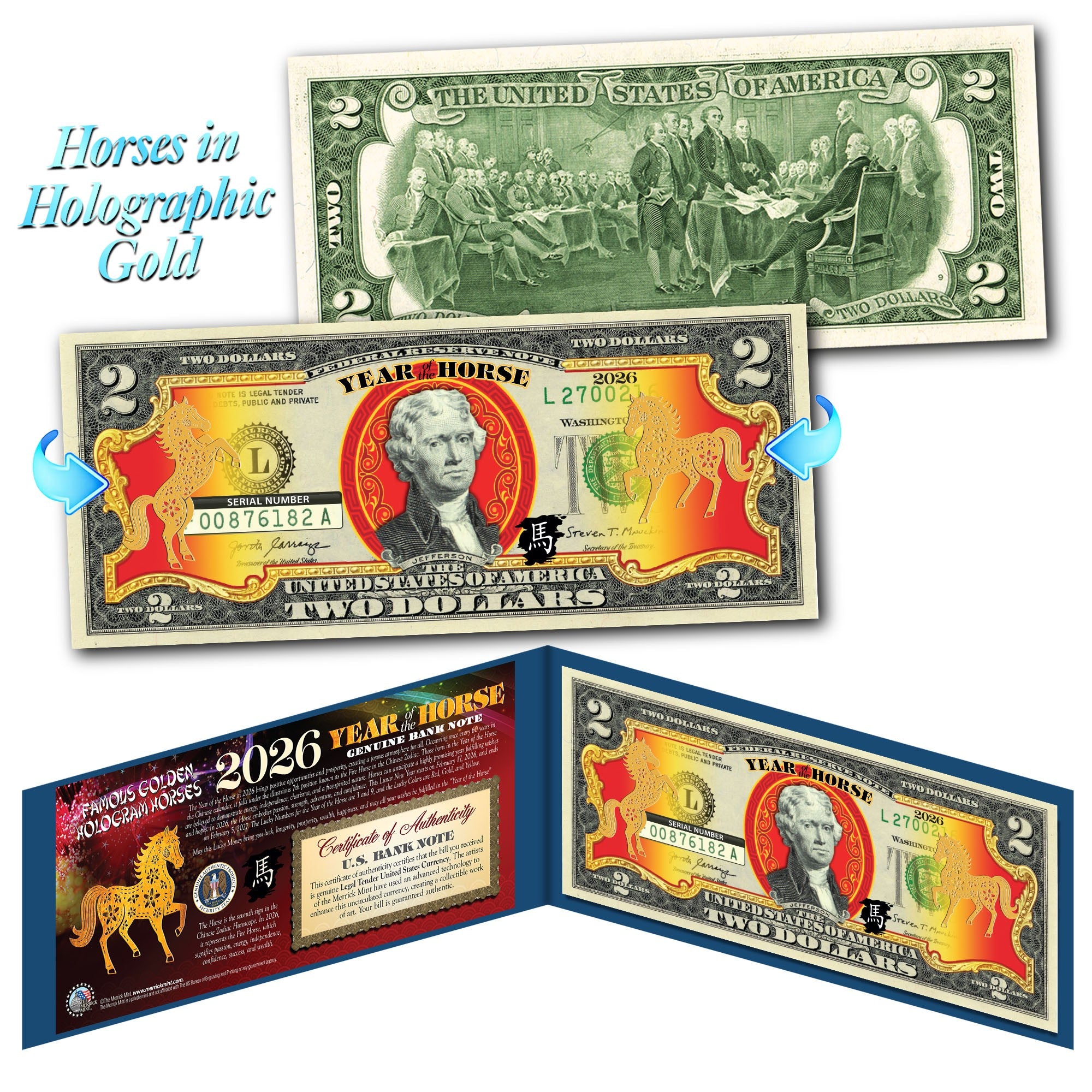 2026 Chinese New Year - YEAR OF THE HORSE - Gold Hologram Legal Tender U.S. $2 BILL - $2 Lucky Money with Blue Folio